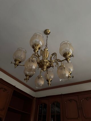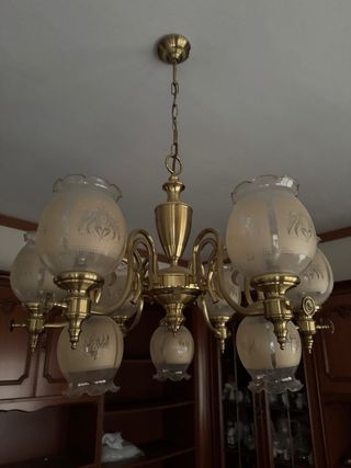 Elegante lámpara colgante de estilo vintage. Su diseño combina metal y cristal para un toque clásico. - Acabado en tono dorado. - Pantallas de cristal con detalles. - Estructura metálica robusta. Sin desperfectos