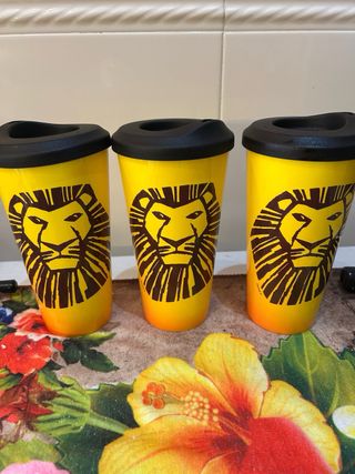 Set de tres vasos con tapa y un cubo para palomitas del musical El Rey León. Son perfectos para llevar tus bebidas y palomitas. - Diseño inspirado en El Rey León. - Tapa negra para los vasos para un cierre seguro. - Ideales para coleccionistas o fans del musical.