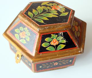 Elegante caja de madera con forma octogonal, de estilo vintage y con un diseño inspirado en la India. Presenta una base negra decorada con motivos florales pintados a mano en tonos naranjas y verdes, rodeados por un borde rojo y dorado. Medidas : 12 cm alto x 15 x 15 cm , peso 429 grms Se usa tambien como caja nupcial , tradicional de la India , ó joyero - Diseño octogonal. - Pintura floral artesanal. - Acabado en madera.