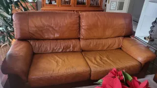 Sofá de dos plazas con un diseño clásico y elegante. - Tapicería de piel. - Color marrón cálido. - Estructura robusta.