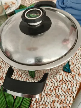 Olla de acero inoxidable con tapa y asa. - Asa de plástico negro. - Tapa con termómetro integrado. - Diseño moderno y funcional.