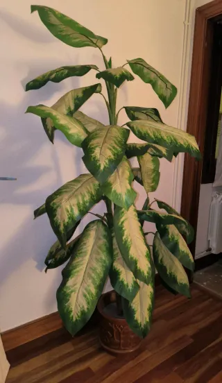 Planta de interior con hojas verdes y amarillas, ideal para dar vida a tu hogar. Se encuentra en una maceta de ceramica con un diseño grabado. - Hojas grandes y llamativas. - Maceta de terracota incluida. Tiene una altura de 1,70