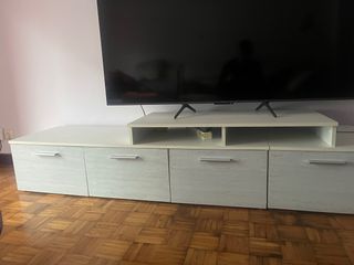 Mueble de salón con un diseño moderno y funcional. - Acabado en blanco y marrón. - Fabricado con materiales de calidad. - Un armario vertical de colgar 52x103 - Un armario horizontal de colgar 101x52 - Un armario bajo de televisión con un modulo de dos puertas y otro de tres 251 lar. X 34 al. X 47 fon. - También mesa de salon de centro blanca SERIA NECESARIO VENIR A RECOGERLO A PIE DE CALLE.