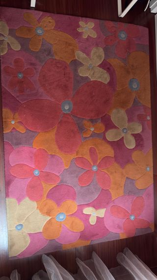 Alfombra con un diseño alegre y colorido de flores. - Motivos florales en tonos naranjas y rosas. - Fabricada en tela.