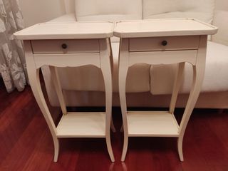 Pareja de mesitas auxiliares de estilo clásico, en color crema y en estado impecable. Cada mesa incluye: • Un cajón con tirador metálico • Bandeja inferior para almacenamiento • Patas curvas de diseño elegante • Acabado resistente y fácil de limpiar Perfectas para salón, dormitorio o entrada. Se venden juntas. Muy cuidadas, sin golpes ni arañazos. Se entregan en persona. Recogida en Santurtzi