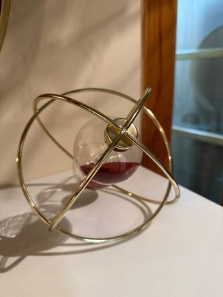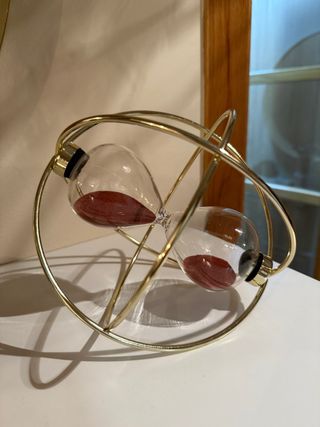 Elegante reloj de arena con un diseño moderno y sofisticado. - Estructura metálica dorada. - Cuerpo de cristal transparente. - Arena de color rojizo.