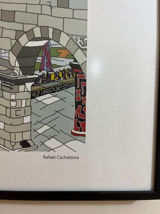 Obra del pintor Rafael Cachaldora titulada Ourense, Praza Maior. - Representación de una plaza urbana con arquitectura detallada. - Colores predominantes: gris y multicolor. -Lamina enmarcada en aluminio