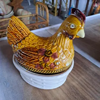 Bonita huevera con forma de gallina, elaborada en porcelana de Caldas da Rainha, por Pereira. - Base blanca con textura. - Tonos ocres y marrones.