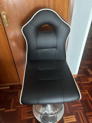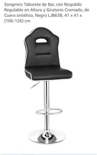 Taburete de bar con diseño moderno y elegante. - Respaldo regulable en altura. - Asiento giratorio. - Base cromada. - Tapizado en cuero sintético negro.