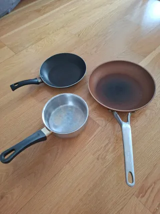 Olla grande, cacillo y sarten pequeña, todavía se pueden usar sin problema y moldes y bandeja horno.