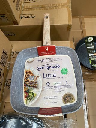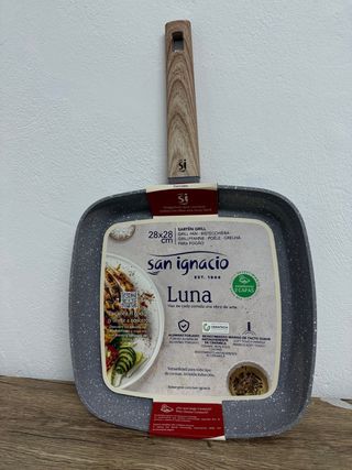 Sartén grill cuadrada de la marca San Ignacio, modelo Luna. Perfecta para cocinar tus platos favoritos. - Medidas: 28x28 cm. - Revestimiento antiadherente de cerámica. - Mango de tacto suave. - Apta para todo tipo de cocinas, incluida inducción.