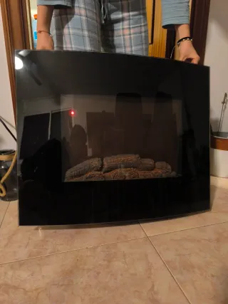 Chimenea eléctrica de pared con un diseño moderno y elegante. Añade un toque acogedor a tu hogar. - Marco frontal de cristal negro brillante. - Efecto de llama realista y ajustable. - Fácil instalación en la pared. - Función de estufa.