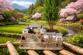 Maceta pueblo japonés con bonsái.