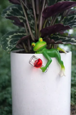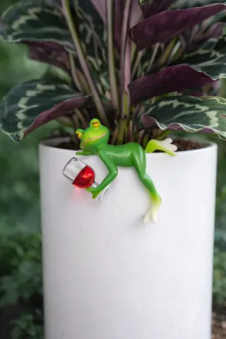 Rana decorativa para maceta con copa de vino.