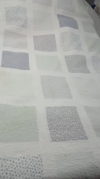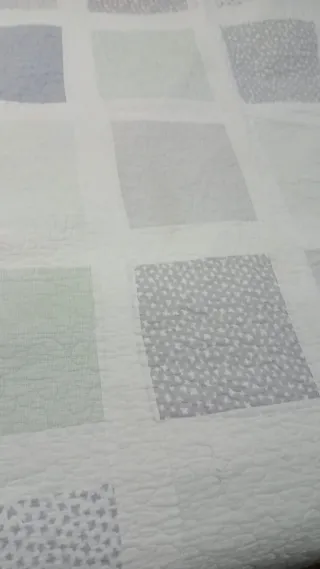 Colcha de tela gris y blanca