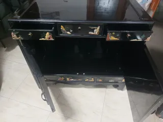 Elegante mesita auxiliar con un diseño oriental y detalladas incrustaciones. - Acabado principal en negro brillante. - Decoración con motivos de paisajes y figuras. - Materiales de piedra y madera.