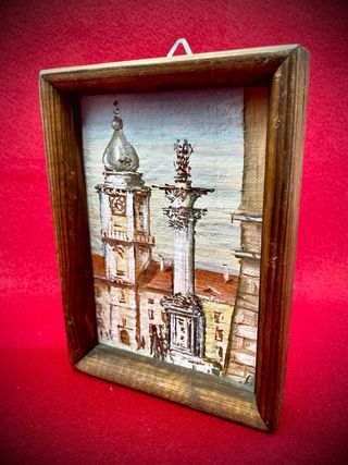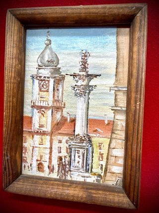 Pequeño cuadro decorativo en óleo con una escena de Polonia, firmado por el artista y otros - Marco de madera. - Representación de una localidad polaca. - Sello firma visible y otros. - Tamaño:Alto 17,5 cm., X 13 cm.