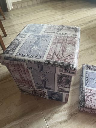 Puf plegable con un diseño original inspirado en sellos postales de Canadá. - Diseño de sellos postales de Canadá. - Plegable para fácil almacenamiento., es resistente para sentarse tengo dos , uno por 18€ y los 2 por 35€