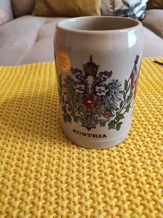 Jarra de cerámica austríaca de 1/2 litro de volumen para cerveza. Es de cerámica y tiene impreso el escudo del Imperio Austríaco Tiene pegada la etiqueta de "original de Austria" y en su base lleva impreso el sello del fabricante y grabados su capacidad de peso y volumen.. Medidas: Diámetro de la base 9 cm. Diámetro de la boca 8 cm. Altura 13 cm. Está nueva, porque no se ha usado nunca.