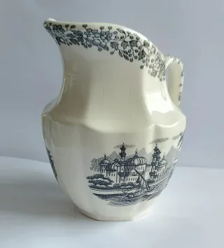 Preciosa lechera de la icónica colección "Vistas Negro" de la prestigiosa firma La Cartuja de Sevilla - Pickman. Un clásico de la loza española con diseño Ochavado (octogonal) y paisajes románticos estampados Sello: Original del periodo 1960-1980. Pieza con carácter vintage. Presenta el craquelado natural del esmalte por el paso del tiempo y un pequeño chip (ver fotos de detalle). Altura total 13.5 cm Ancho base: 5.5cm Largo total aproximado; 15 cm