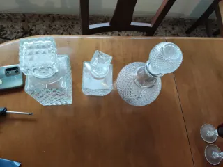 Set de tres botellas de cristal con un diseño tallado. - Diseño geométrico. - Tapones para sellar. - Ideal para licores o decoración. Se venden juntas o por separado.