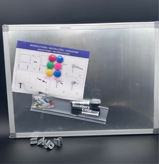 📍Producto nuevo, sellado Tamaño 60x45 (A2 aprox) ✅ Mitad pizarra blanca magnética de borrado en seco: superficie lisa, duradera y fácil de limpiar. ¡Totalmente magnética para sujetar fotos, notas o recordatorios con imanes! ✅ Mitad tablero de corcho gris: para fijar fotos, postales, tickets, dibujos o motivación diaria con chinchetas (incluye 6 chinchetas de colores) ✅ Marco de aluminio plateado resistente y elegante ✅ Incluye rotulador de borrado en seco + bandeja inferior para guardar accesorios ✅ Fácil montaje: se cuelga vertical u horizontalmente en la pared (tornillos incluidos) Entregas a domicilio Valencia o envíos 24H 🚙