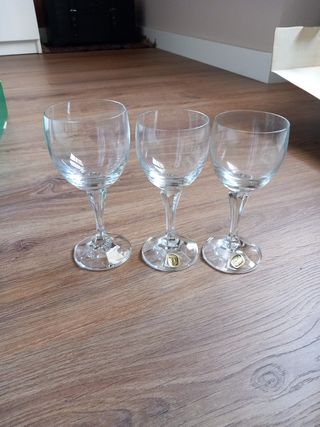 Nuevas. Vintage años 60. Con sello original. Marca Jolly (de lo que antes era Checoslovaquia). El juego consta de: - 6 copas de agua de 230 ml - 12 copas de vino de 190 ml - 6 copas de vino de 150 ml