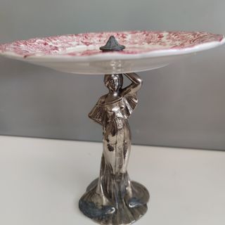 Raro y exclusivo frutero o bandeja para pastas o aperitivos. Soporte metálico plateado de estilo Art Nouveau de principios del XX con plato de La Cartuja en tonos color vino. Sello de marca numerado. Diámetro 20,5 cm Altura 21.
