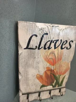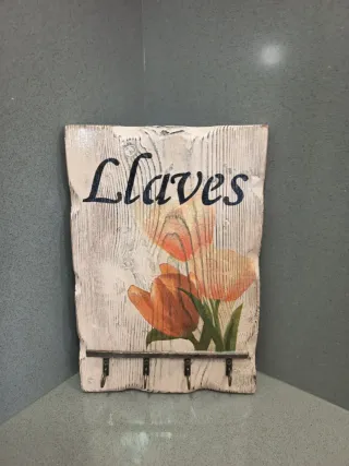 Este colgador de llaves decorativo añade un toque floral a tu hogar. Presenta un diseño rústico con un estampado de tulipanes. - Base de madera con acabado envejecido. - Detalle de tulipanes en tonos naranjas y rosados. - Incluye ganchos metálicos para colgar llaves.