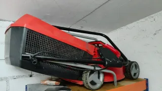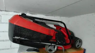 Cortacésped a batería en color rojo y negro, marca Eheim. - Diseño plegable para un fácil almacenamiento. - Ruedas para movilidad. - Funciona con bateria recargable (no se incluye, pero tengo una a parte).