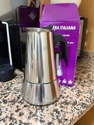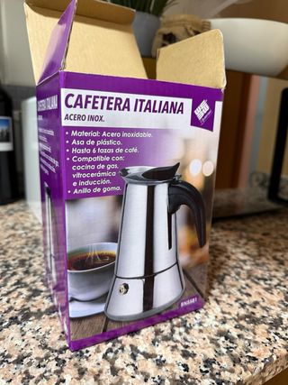 Cafetera italiana de la marca WE, fabricada en acero inoxidable. - Material: Acero inoxidable. - Asa de plástico. - Capacidad para hasta 6 tazas de café. - Compatible con cocinas de gas, vitrocerámica e inducción. - Incluye anillo de goma.