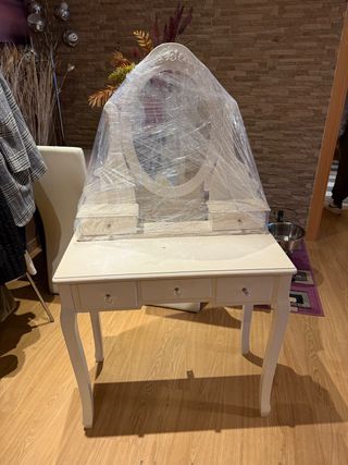 Elegante tocador con espejo ovalado y un diseño clásico. - Acabado en color blanco/beige. - Tres cajones frontales para almacenamiento. - Patas curvas para un toque de estilo. - Incluye espejo.