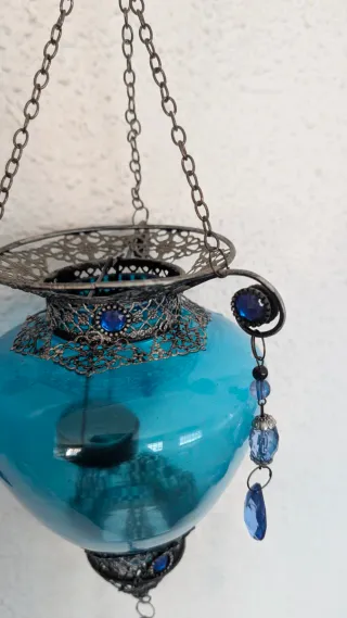 Lámpara de cristal con detalles metálicos, perfecta para colocar velas. - Diseño colgante con cadena. - Adornos de cristal azul. - Base y detalles superiores de metal ornamentado. El largo de las medidas es con la cadena, la lámpara en sí mide 30cm. Lo único que tiene es un punto de silicona (ver última foto) que ya tenía al comprarla, de pegar la base metálica al vidrio, se puede sacar.