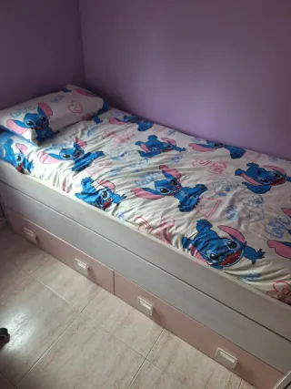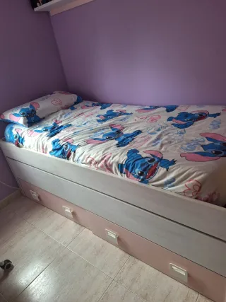 Cama nido con un diseño infantil y divertido, perfecta para habitaciones. - Medidas de 190x90 cm. - Incluye dos amplias cajoneras para almacenamiento.se entrega con los 2 somieres y los 2 colchones si se quiere.estan muy bien y sin manchas.la estructura de la cama es de 1'99x96