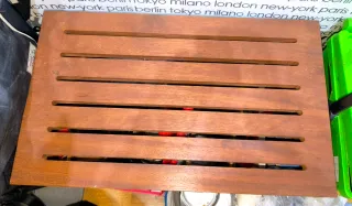 Banquito de madera con un diseño de listones. - Estructura de madera. - Tonos marrones y cerezo Está como nuevo. No se envia.