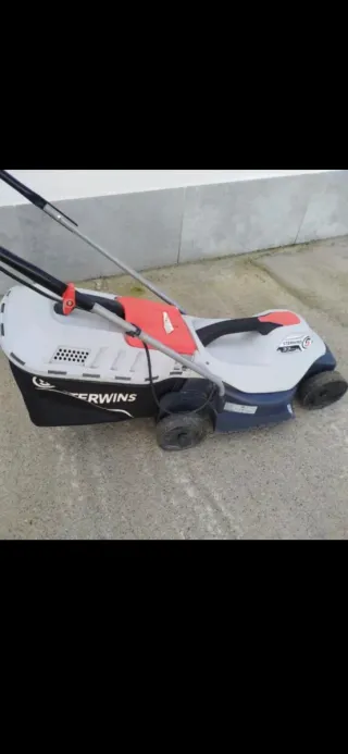 Cortacésped eléctrico Sterwins en buen estado. Ideal para mantener tu jardín. - Color gris y azul. - Cesta recolectora de césped. - Ruedas para fácil desplazamiento.