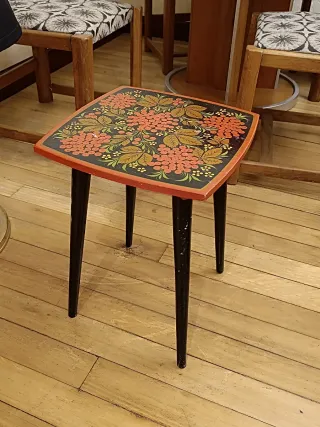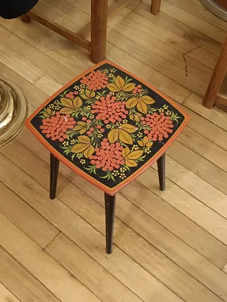 Taburete de estilo Khokloma, una hermosa pieza de artesanía de la URSS. Su diseño pintado a mano le da un toque único y artístico. - Diseño pintado a mano con motivos florales. - Tabla roja y patas negras. El estilo Khokloma o Xhoxloma es un tipo de arte muy popular en la amtigua Unión Soviética. Fabricado en el antiguo Krai de Gorki, actual Oblast de Nizhni Nóvgorod. Se mantiene en bastante buen estado aunque el dibujo se ha desconchado en un par de zonitas del tablero, y en general el taburete tiene algunos roces que han saltado la pintura. Precio negociable