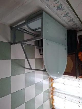 Mesa de cocina con superficie de cristal y estructura metálica. - Diseño moderno y funcional. - Acabado transparente en la tapa. - Patas plegables para fácil almacenamiento.