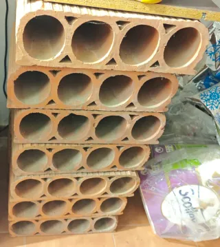 Lote de ladrillos de terracota con huecos para botellas. - Diseño apilable. - Material: Terracota. - Cada ladrillo tiene capacidad para varias botellas.