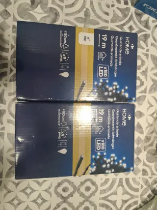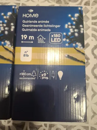 Guirnalda de luces LED de la marca HOME, con 19 metros de longitud y 180 luces. - Apta para interior y exterior. - 9 funciones de programación. - Longitud recomendada de 180 cm. Tengo 2 unidades. 5€ cada una. Por las 2 10€.