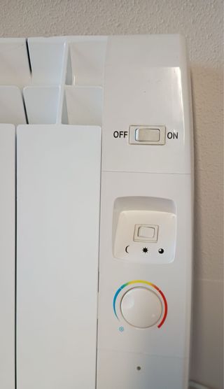 Radiador eléctrico de color blanco. - Interruptor ON/OFF. - Selector de modo (luna, sol, punto). - Control de temperatura con indicador de color.