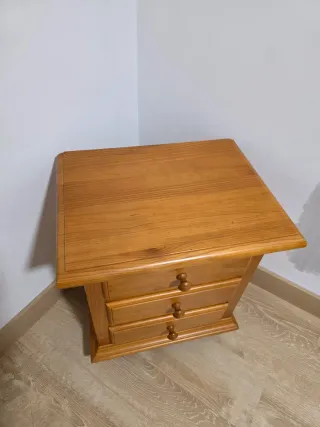 Mesita de noche con un diseño clásico y elegante. - Tres cajones con tiradores redondos. - Patas torneadas. - Acabado en madera natural. Medidas en las fotos. En perfecto estado.