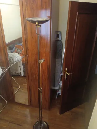 Elegante lámpara de pie con un diseño moderno y sofisticado. Combina acabados metálicos en tonos dorados y plateados para un toque de distinción. - Base estable.
