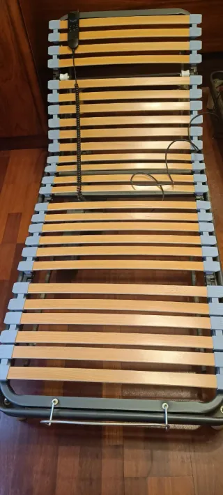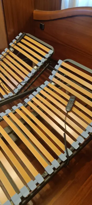 Base de cama articulada BODYFLEX, ideal para un descanso personalizado. - Estructura metálica resistente. Sin la manivela, extraviada - Láminas de madera para un soporte flexible. - Color beige y marrón.