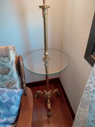 Elegante lámpara de pie con un diseño clásico y un toque de distinción. Cuenta con una práctica mesa auxiliar integrada. - Base y estructura principal en metal dorado. - Mesa redonda de cristal transparente. - Pantalla cónica de tela en tono crema.