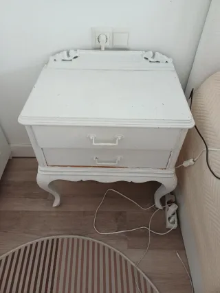 Elegante mesita de noche de estilo clásico. Añade un toque de distinción a tu dormitorio. - Diseño con dos cajones. - Patas curvas ornamentadas. - Acabado en blanco.