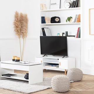El mueble de TV JOEY, de estilo escandinavo atemporal, encajará perfectamente en su hogar gracias a sus líneas minimalistas y su diseño puro. Su larga estantería le permitirá colocar todos sus objetos de decoración. Sus espacios de almacenamiento - dos estantes y dos armarios - le ayudarán a guardar todos sus accesorios de televisión o documentos. La parte trasera de la unidad tiene dos agujeros para pasar los cables. - Mueble: L 120 × An 40 × Al 45cm - Estantes : L 59,6 × An 40 × Al 11,75cm - Casilleros : L 30 × An 40 × Al 26,4cm - Altura de las patas : Al 15cm - Estructura: melamina - Patas: madera - Peso máximo soportado: 35 kg
