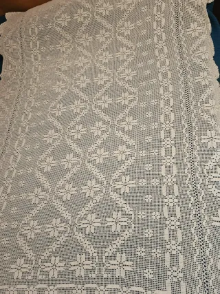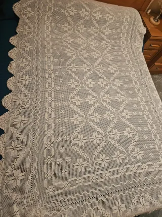 Colcha de ganchillo hecha a mano, perfecta para camas de 135cm. Su diseño intrincado añade un toque de elegancia y calidez a cualquier habitación. - Elaborada con técnica de ganchillo. Tamaño aproximado de 170x230 y puntilla de 20cm
