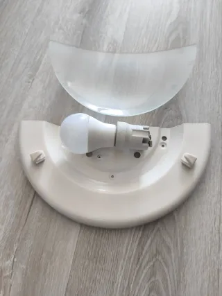 Aplique de pared con un diseño moderno y elegante. Su acabado combina cristal y plástico para un toque contemporáneo. - Forma semicircular. - Base de plástico blanco. - Difusor de cristal translúcido.