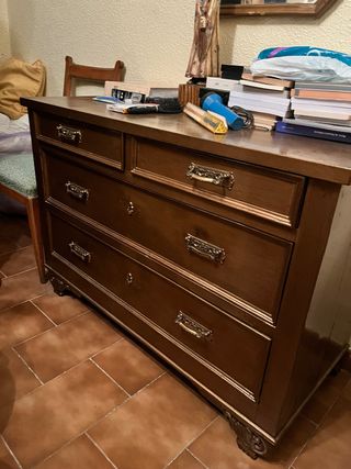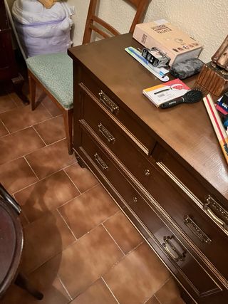 Vendo dormitorio clásico de madera de color nogal en perfecto estado pero con algunas pequeñas marcas de uso, compuesto por: -Cómoda de 5 cajones +2 pequeños tipo tocador y espejo. -2 mesitas de noche de 4 cajones -Cabezal de forja y barra de madera. Precio un poco negociable. No ago envíos.